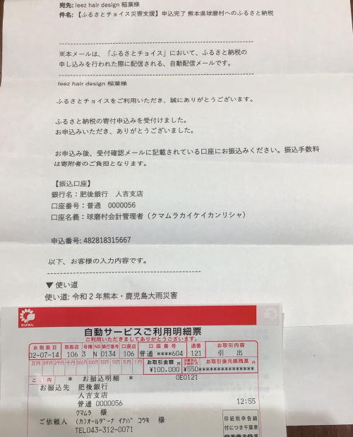 あとご報告ですが、期間限定でおこなっておりましたLINKトリートメントの売上全額67000円と当社より33000円合わせて100000円を熊本県球磨村にふるさと納税(返礼品無し)というかたちで寄付させていただきました。